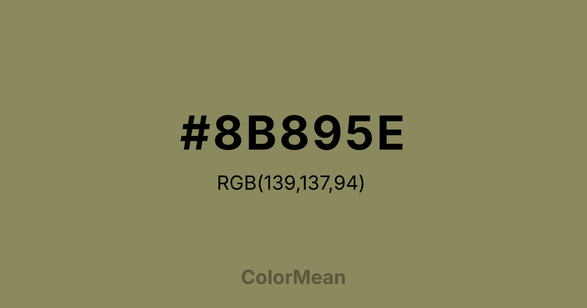 #8B895E RGB value is (139, 137, 94). The hex color red value is 139, green is 137, and blue is 94. Its HSL format shows a hue of 57°, saturation of 19 percent, and lightness of 46 percent. The CMYK process values are 0 percent, 1 percent, 32 percent, 45 percent.