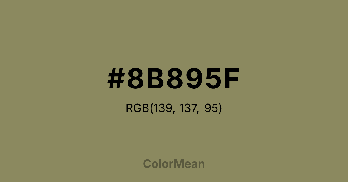 #8B895F RGB value is (139, 137, 95). The hex color red value is 139, green is 137, and blue is 95. Its HSL format shows a hue of 57°, saturation of 19 percent, and lightness of 46 percent. The CMYK process values are 0 percent, 1 percent, 32 percent, 45 percent.