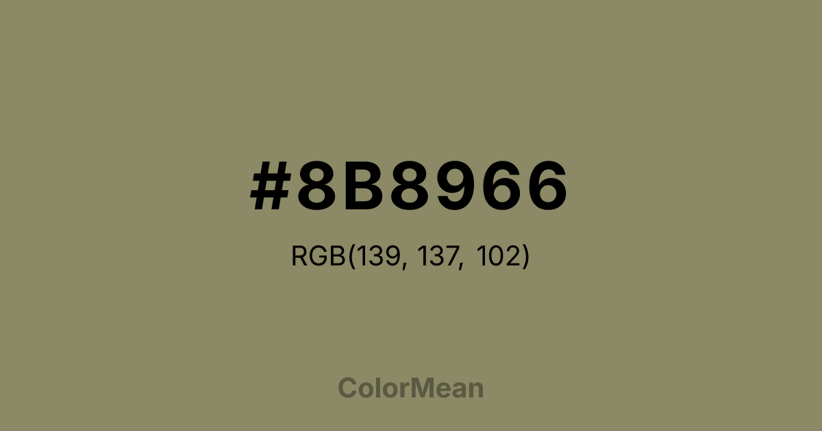 #8B8966 RGB value is (139, 137, 102). The hex color red value is 139, green is 137, and blue is 102. Its HSL format shows a hue of 57°, saturation of 15 percent, and lightness of 47 percent. The CMYK process values are 0 percent, 1 percent, 27 percent, 45 percent.