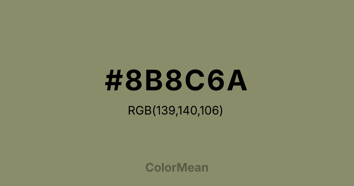 #8B8C6A RGB value is (139, 140, 106). The hex color red value is 139, green is 140, and blue is 106. Its HSL format shows a hue of 62°, saturation of 14 percent, and lightness of 48 percent. The CMYK process values are 1 percent, 0 percent, 24 percent, 45 percent.