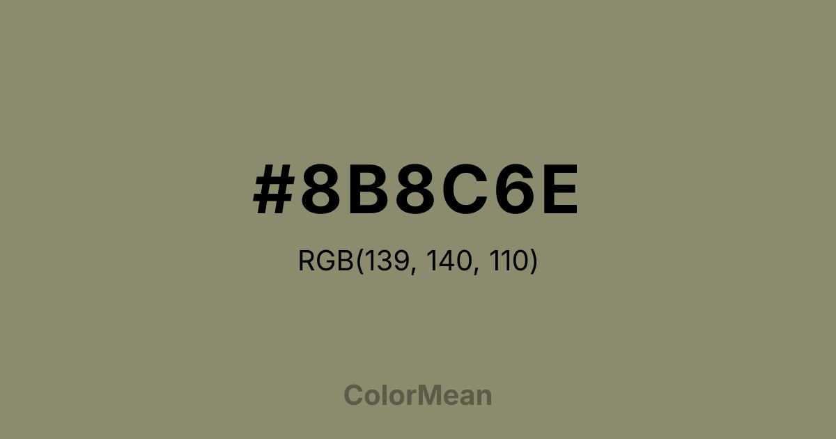 #8B8C6E RGB value is (139, 140, 110). The hex color red value is 139, green is 140, and blue is 110. Its HSL format shows a hue of 62°, saturation of 12 percent, and lightness of 49 percent. The CMYK process values are 1 percent, 0 percent, 21 percent, 45 percent.