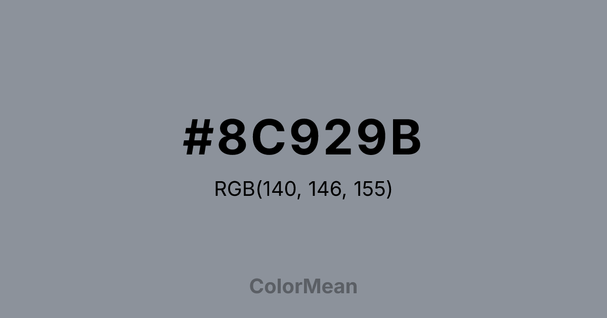 #8C929B RGB value is (140, 146, 155). The hex color red value is 140, green is 146, and blue is 155. Its HSL format shows a hue of 216°, saturation of 7 percent, and lightness of 58 percent. The CMYK process values are 10 percent, 6 percent, 0 percent, 39 percent.