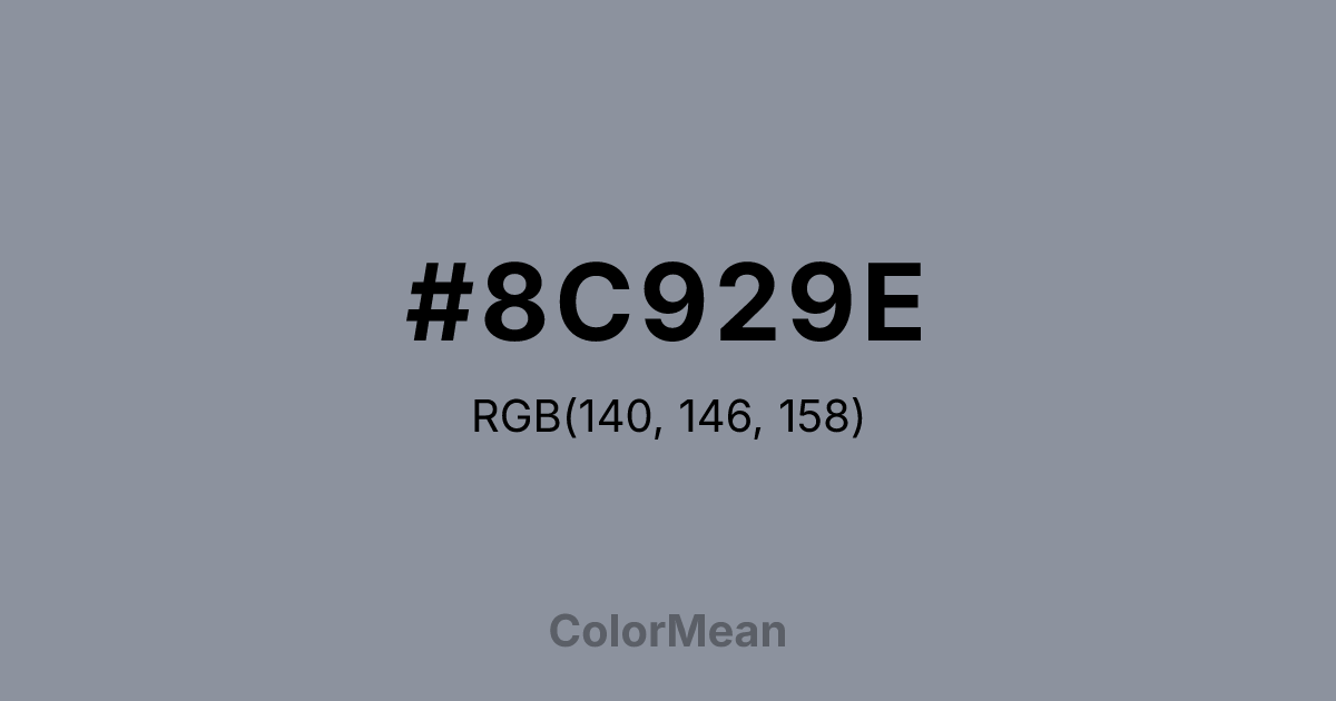 #8C929E RGB value is (140, 146, 158). The hex color red value is 140, green is 146, and blue is 158. Its HSL format shows a hue of 220°, saturation of 8 percent, and lightness of 58 percent. The CMYK process values are 11 percent, 8 percent, 0 percent, 38 percent.