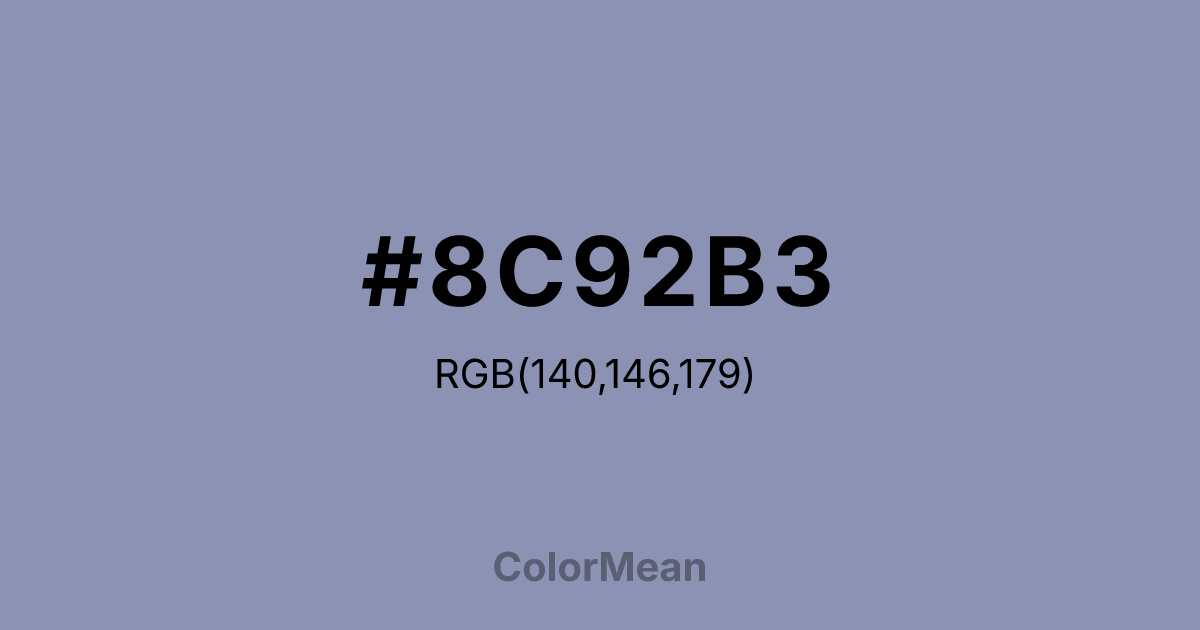 #8C92B3 RGB value is (140, 146, 179). The hex color red value is 140, green is 146, and blue is 179. Its HSL format shows a hue of 231°, saturation of 20 percent, and lightness of 63 percent. The CMYK process values are 22 percent, 18 percent, 0 percent, 30 percent.