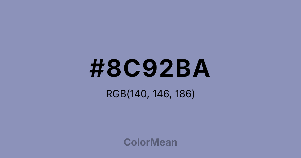 #8C92BA RGB value is (140, 146, 186). The hex color red value is 140, green is 146, and blue is 186. Its HSL format shows a hue of 232°, saturation of 25 percent, and lightness of 64 percent. The CMYK process values are 25 percent, 22 percent, 0 percent, 27 percent.