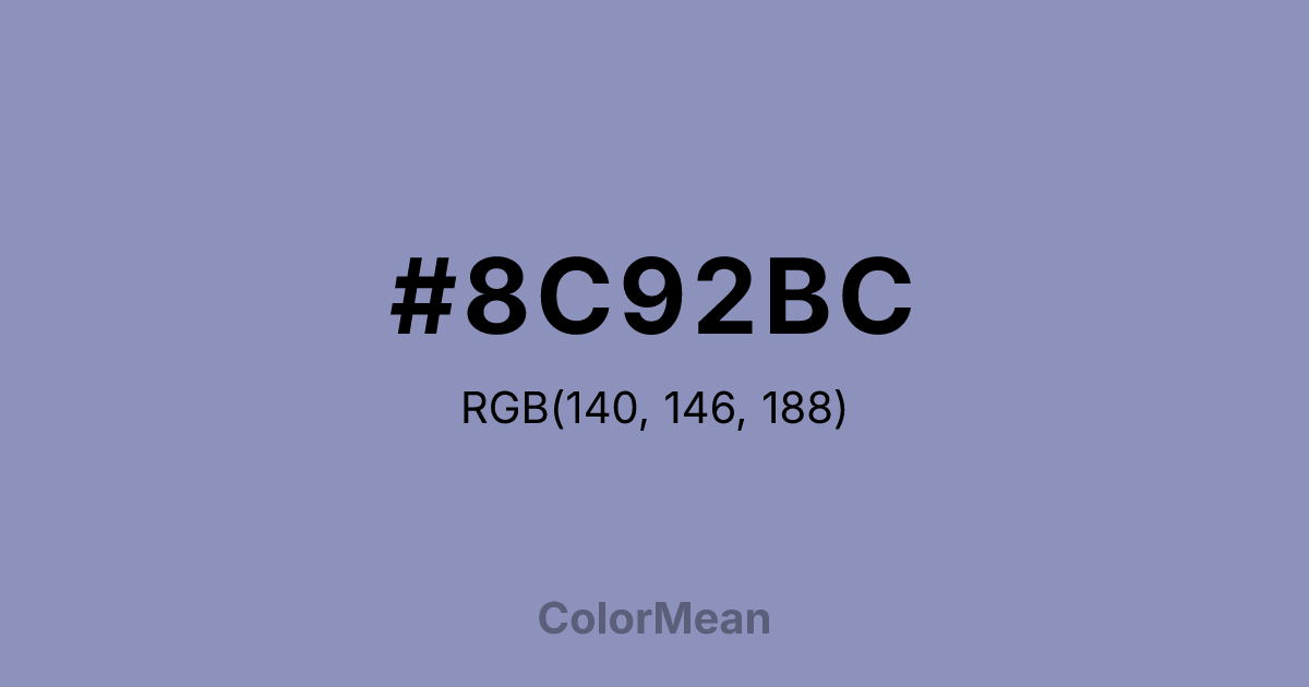 #8C92BC RGB value is (140, 146, 188). The hex color red value is 140, green is 146, and blue is 188. Its HSL format shows a hue of 233°, saturation of 26 percent, and lightness of 64 percent. The CMYK process values are 26 percent, 22 percent, 0 percent, 26 percent.