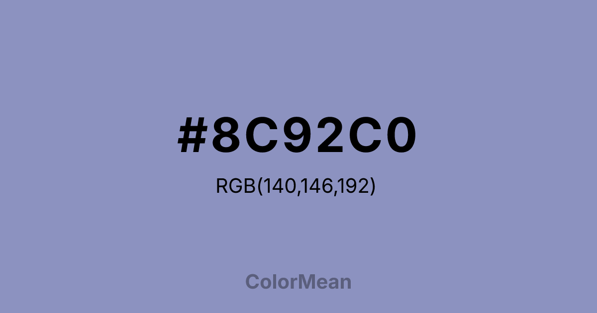 #8C92C0 RGB value is (140, 146, 192). The hex color red value is 140, green is 146, and blue is 192. Its HSL format shows a hue of 233°, saturation of 29 percent, and lightness of 65 percent. The CMYK process values are 27 percent, 24 percent, 0 percent, 25 percent.