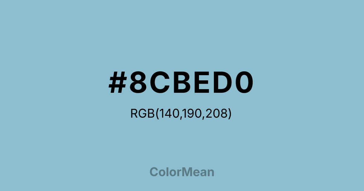 #8CBED0 RGB value is (140, 190, 208). The hex color red value is 140, green is 190, and blue is 208. Its HSL format shows a hue of 196°, saturation of 42 percent, and lightness of 68 percent. The CMYK process values are 33 percent, 9 percent, 0 percent, 18 percent.
