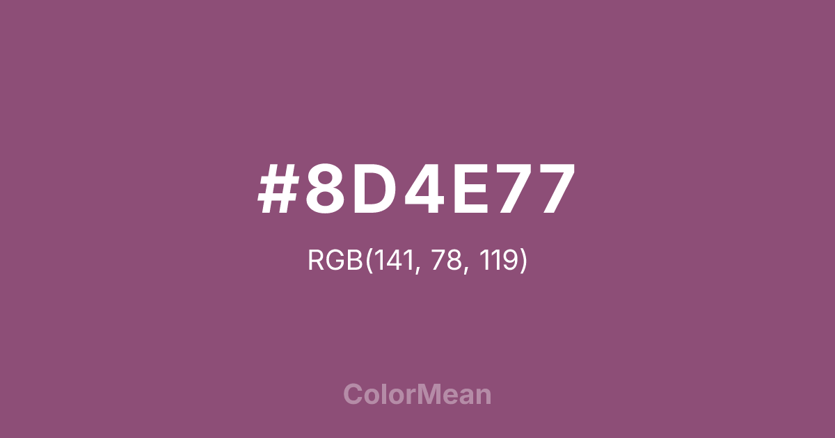 #8D4E77 RGB value is (141, 78, 119). The hex color red value is 141, green is 78, and blue is 119. Its HSL format shows a hue of 321°, saturation of 29 percent, and lightness of 43 percent. The CMYK process values are 0 percent, 45 percent, 16 percent, 45 percent.