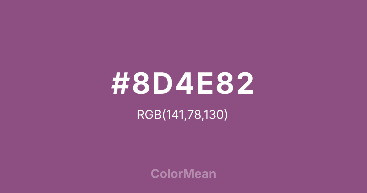 #8D4E82 RGB value is (141, 78, 130). The hex color red value is 141, green is 78, and blue is 130. Its HSL format shows a hue of 310°, saturation of 29 percent, and lightness of 43 percent. The CMYK process values are 0 percent, 45 percent, 8 percent, 45 percent.