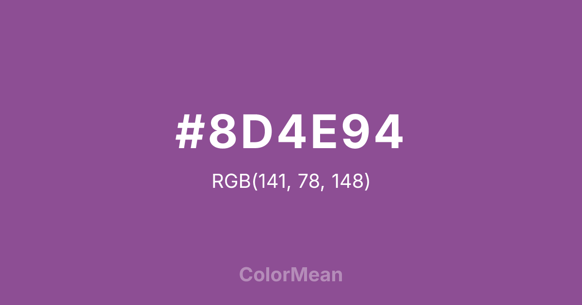 #8D4E94 RGB value is (141, 78, 148). The hex color red value is 141, green is 78, and blue is 148. Its HSL format shows a hue of 294°, saturation of 31 percent, and lightness of 44 percent. The CMYK process values are 5 percent, 47 percent, 0 percent, 42 percent.