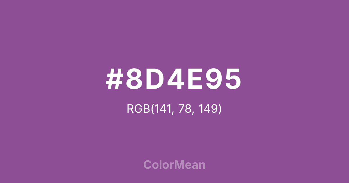 #8D4E95 RGB value is (141, 78, 149). The hex color red value is 141, green is 78, and blue is 149. Its HSL format shows a hue of 293°, saturation of 31 percent, and lightness of 45 percent. The CMYK process values are 5 percent, 48 percent, 0 percent, 42 percent.