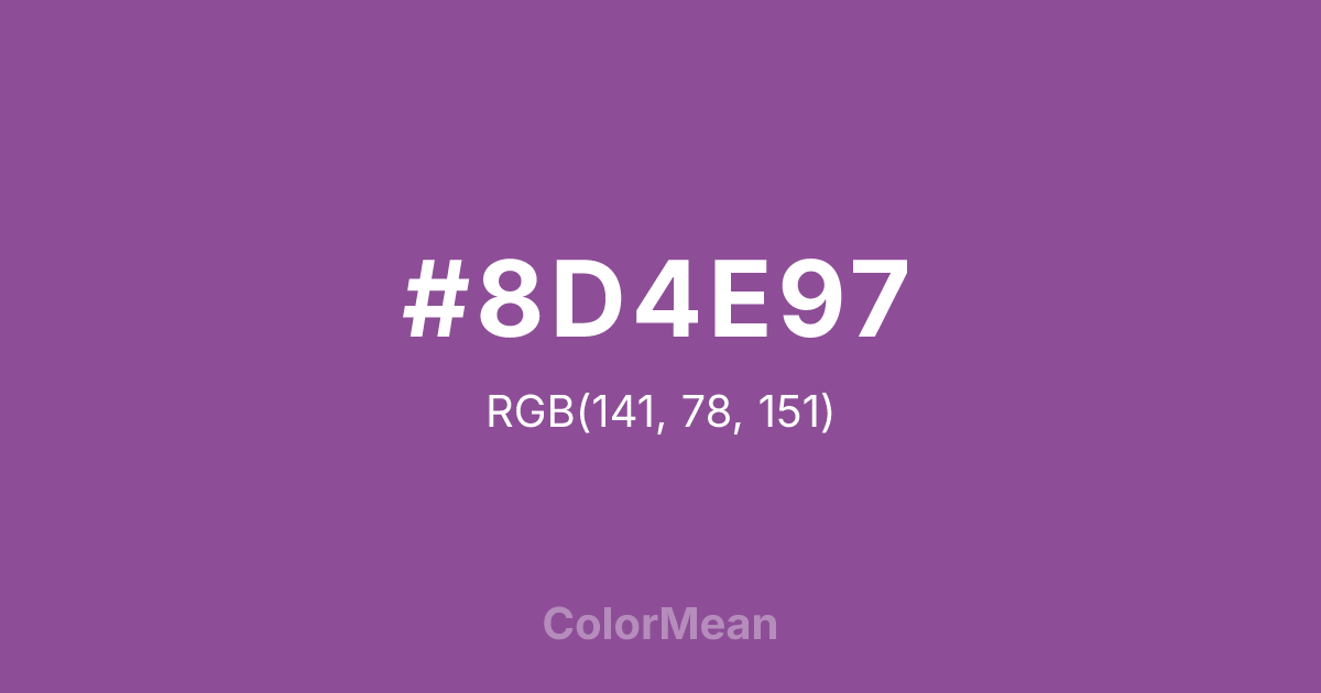 #8D4E97 RGB value is (141, 78, 151). The hex color red value is 141, green is 78, and blue is 151. Its HSL format shows a hue of 292°, saturation of 32 percent, and lightness of 45 percent. The CMYK process values are 7 percent, 48 percent, 0 percent, 41 percent.
