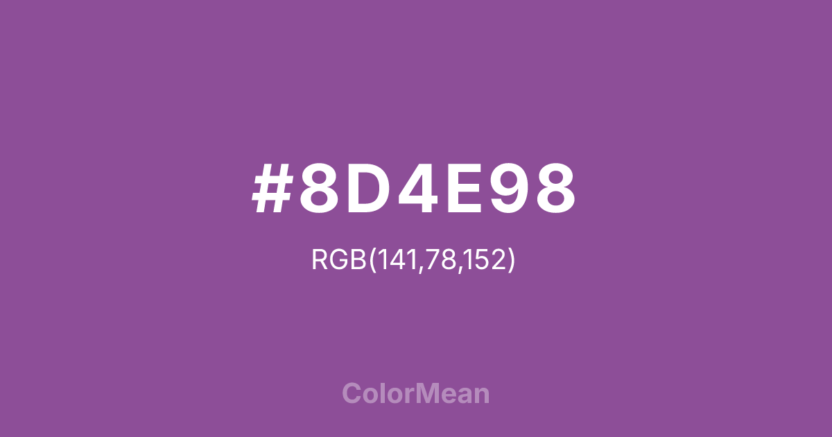 #8D4E98 RGB value is (141, 78, 152). The hex color red value is 141, green is 78, and blue is 152. Its HSL format shows a hue of 291°, saturation of 32 percent, and lightness of 45 percent. The CMYK process values are 7 percent, 49 percent, 0 percent, 40 percent.