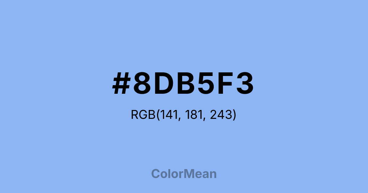 #8DB5F3 RGB value is (141, 181, 243). The hex color red value is 141, green is 181, and blue is 243. Its HSL format shows a hue of 216°, saturation of 81 percent, and lightness of 75 percent. The CMYK process values are 42 percent, 26 percent, 0 percent, 5 percent.