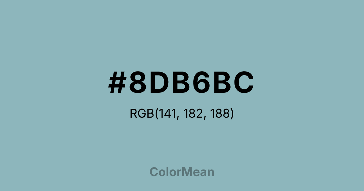 #8DB6BC RGB value is (141, 182, 188). The hex color red value is 141, green is 182, and blue is 188. Its HSL format shows a hue of 188°, saturation of 26 percent, and lightness of 65 percent. The CMYK process values are 25 percent, 3 percent, 0 percent, 26 percent.