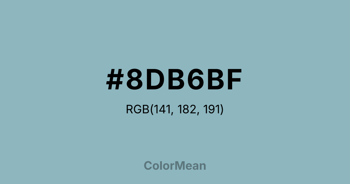 #8DB6BF RGB value is (141, 182, 191). The hex color red value is 141, green is 182, and blue is 191. Its HSL format shows a hue of 191°, saturation of 28 percent, and lightness of 65 percent. The CMYK process values are 26 percent, 5 percent, 0 percent, 25 percent.