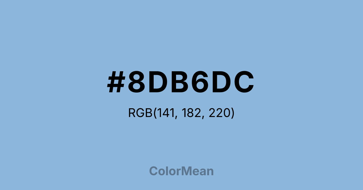 #8DB6DC RGB value is (141, 182, 220). The hex color red value is 141, green is 182, and blue is 220. Its HSL format shows a hue of 209°, saturation of 53 percent, and lightness of 71 percent. The CMYK process values are 36 percent, 17 percent, 0 percent, 14 percent.