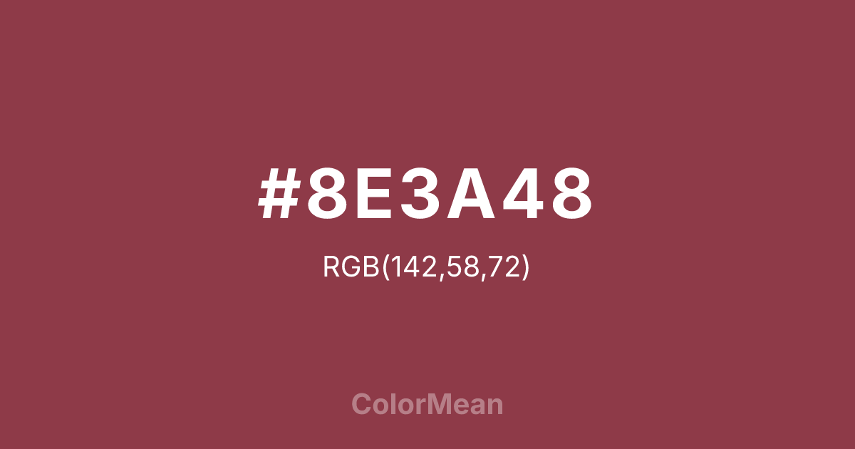 #8E3A48 RGB value is (142, 58, 72). The hex color red value is 142, green is 58, and blue is 72. Its HSL format shows a hue of 350°, saturation of 42 percent, and lightness of 39 percent. The CMYK process values are 0 percent, 59 percent, 49 percent, 44 percent.