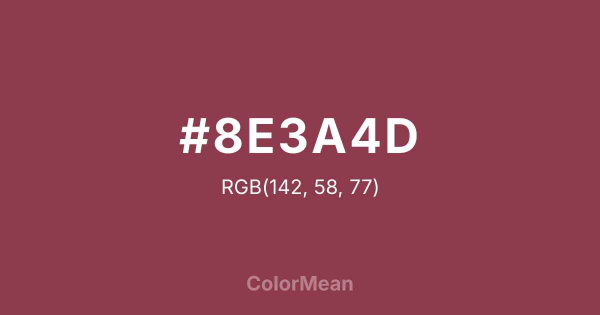 #8E3A4D RGB value is (142, 58, 77). The hex color red value is 142, green is 58, and blue is 77. Its HSL format shows a hue of 346°, saturation of 42 percent, and lightness of 39 percent. The CMYK process values are 0 percent, 59 percent, 46 percent, 44 percent.