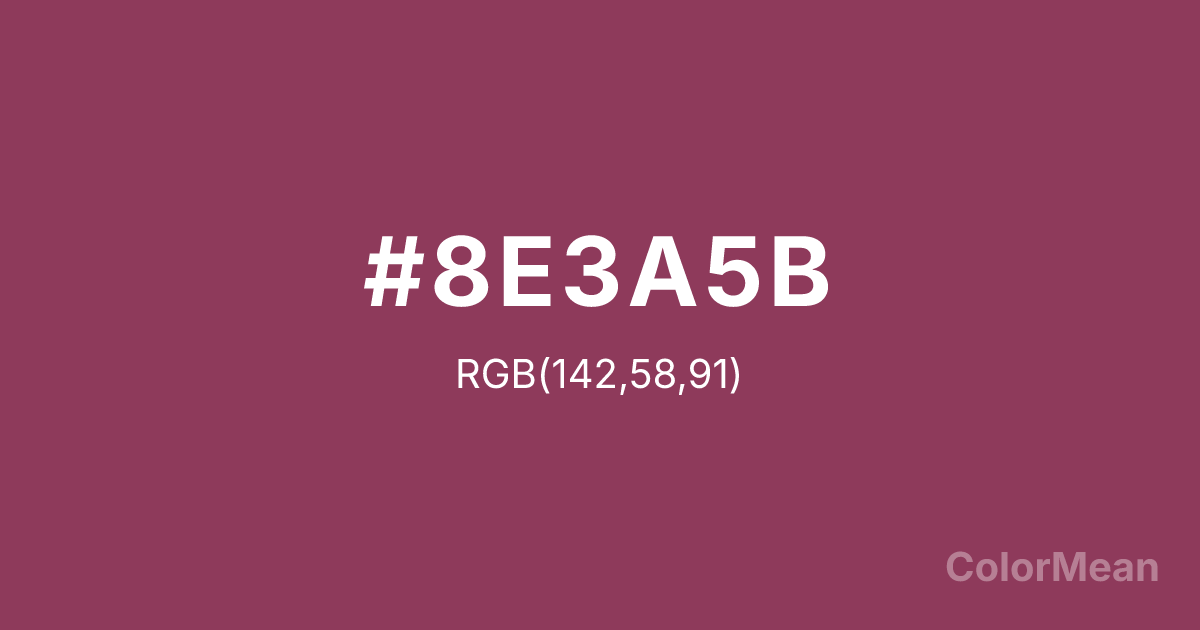 #8E3A5B RGB value is (142, 58, 91). The hex color red value is 142, green is 58, and blue is 91. Its HSL format shows a hue of 336°, saturation of 42 percent, and lightness of 39 percent. The CMYK process values are 0 percent, 59 percent, 36 percent, 44 percent.