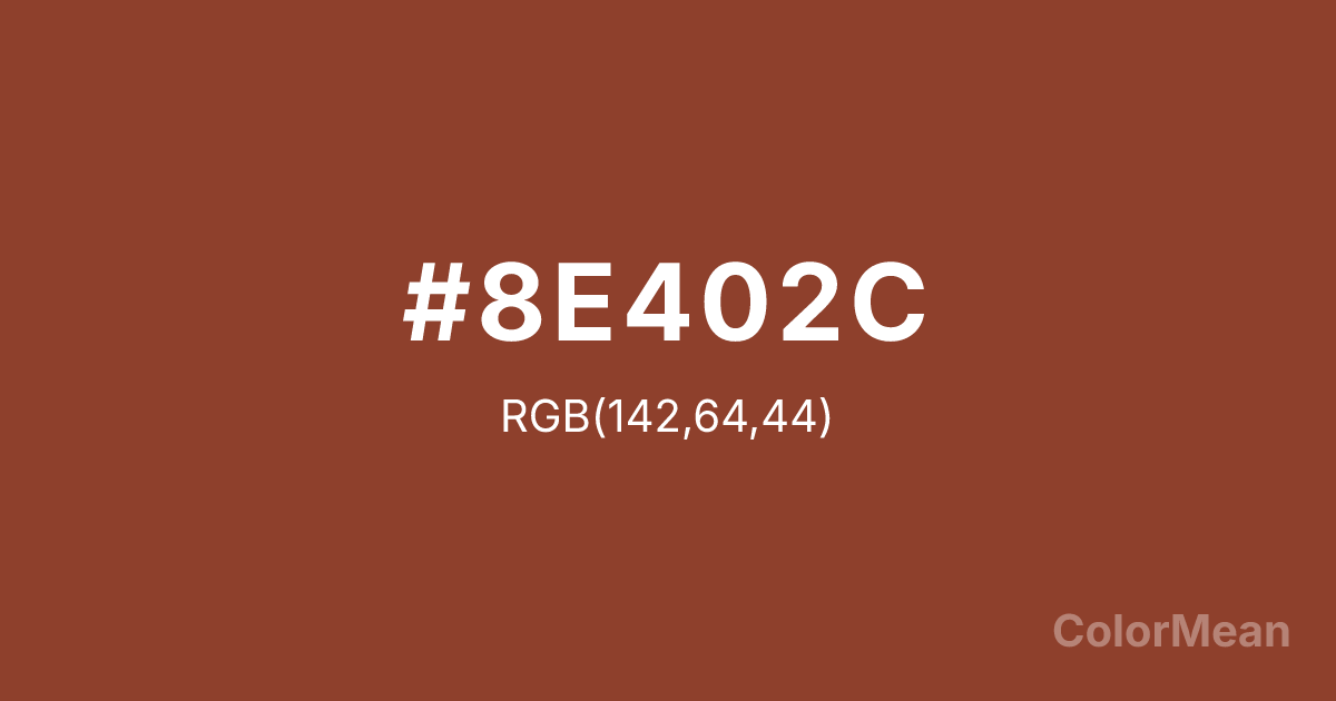 #8E402C RGB value is (142, 64, 44). The hex color red value is 142, green is 64, and blue is 44. Its HSL format shows a hue of 12°, saturation of 53 percent, and lightness of 36 percent. The CMYK process values are 0 percent, 55 percent, 69 percent, 44 percent.