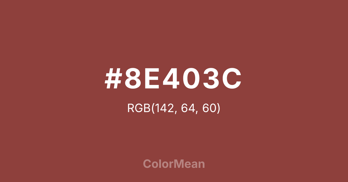 #8E403C RGB value is (142, 64, 60). The hex color red value is 142, green is 64, and blue is 60. Its HSL format shows a hue of 3°, saturation of 41 percent, and lightness of 40 percent. The CMYK process values are 0 percent, 55 percent, 58 percent, 44 percent.