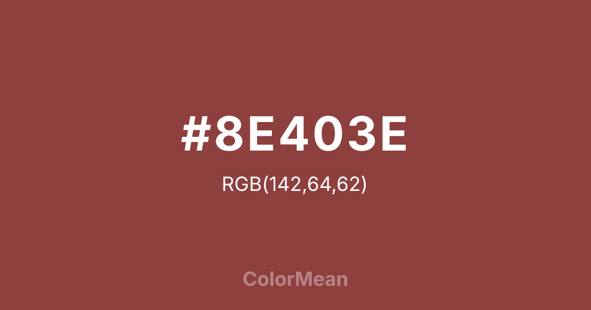 #8E403E RGB value is (142, 64, 62). The hex color red value is 142, green is 64, and blue is 62. Its HSL format shows a hue of 2°, saturation of 39 percent, and lightness of 40 percent. The CMYK process values are 0 percent, 55 percent, 56 percent, 44 percent.