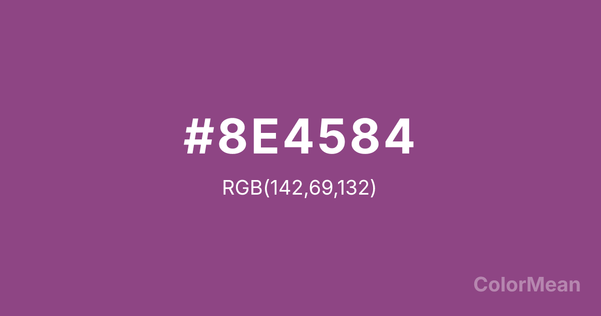 #8E4584 RGB value is (142, 69, 132). The hex color red value is 142, green is 69, and blue is 132. Its HSL format shows a hue of 308°, saturation of 35 percent, and lightness of 41 percent. The CMYK process values are 0 percent, 51 percent, 7 percent, 44 percent.