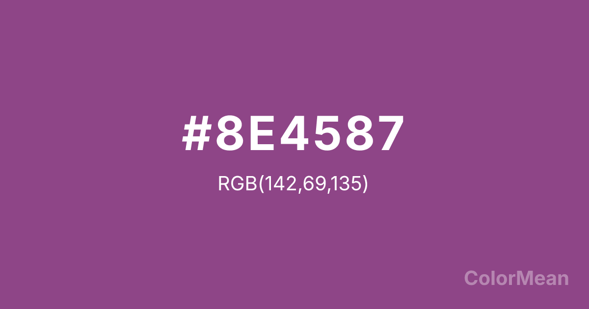 #8E4587 RGB value is (142, 69, 135). The hex color red value is 142, green is 69, and blue is 135. Its HSL format shows a hue of 306°, saturation of 35 percent, and lightness of 41 percent. The CMYK process values are 0 percent, 51 percent, 5 percent, 44 percent.