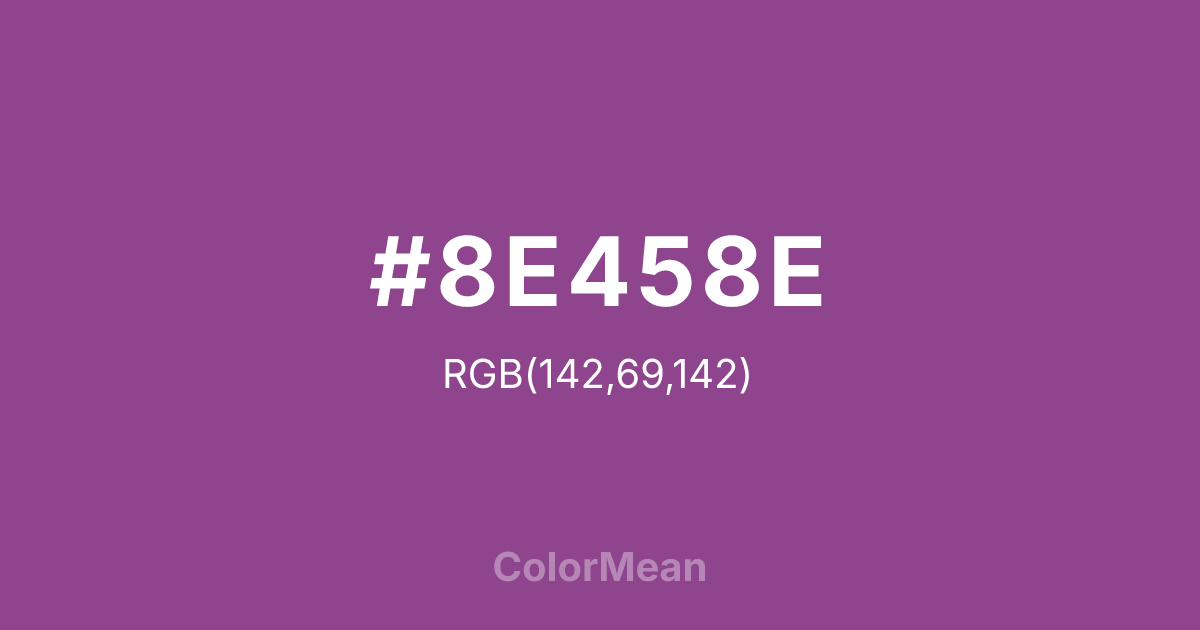 #8E458E RGB value is (142, 69, 142). The hex color red value is 142, green is 69, and blue is 142. Its HSL format shows a hue of 300°, saturation of 35 percent, and lightness of 41 percent. The CMYK process values are 0 percent, 51 percent, 0 percent, 44 percent.
