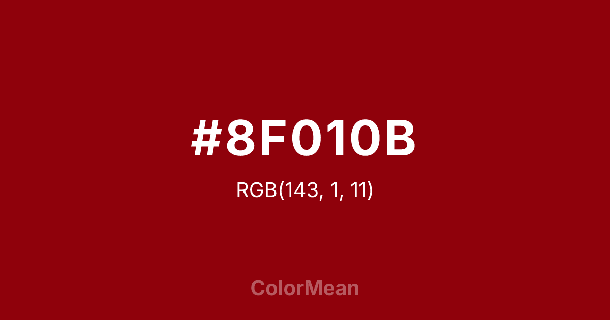 #8F010B RGB value is (143, 1, 11). The hex color red value is 143, green is 1, and blue is 11. Its HSL format shows a hue of 356°, saturation of 99 percent, and lightness of 28 percent. The CMYK process values are 0 percent, 99 percent, 92 percent, 44 percent.