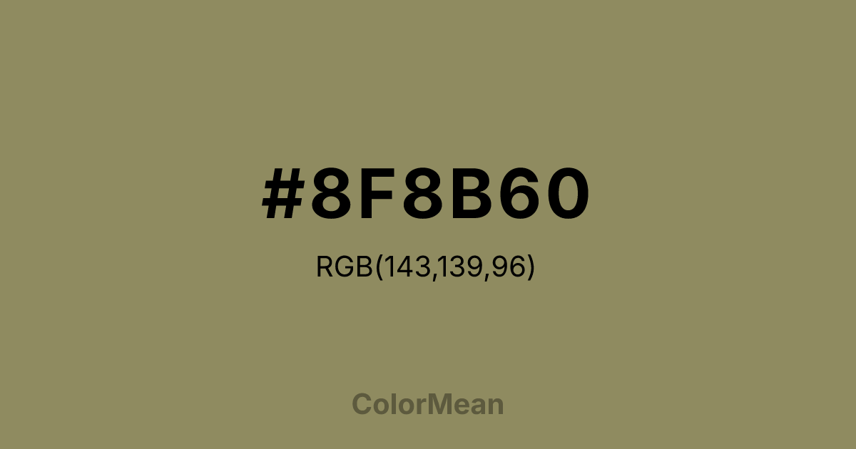 #8F8B60 RGB value is (143, 139, 96). The hex color red value is 143, green is 139, and blue is 96. Its HSL format shows a hue of 55°, saturation of 20 percent, and lightness of 47 percent. The CMYK process values are 0 percent, 3 percent, 33 percent, 44 percent.