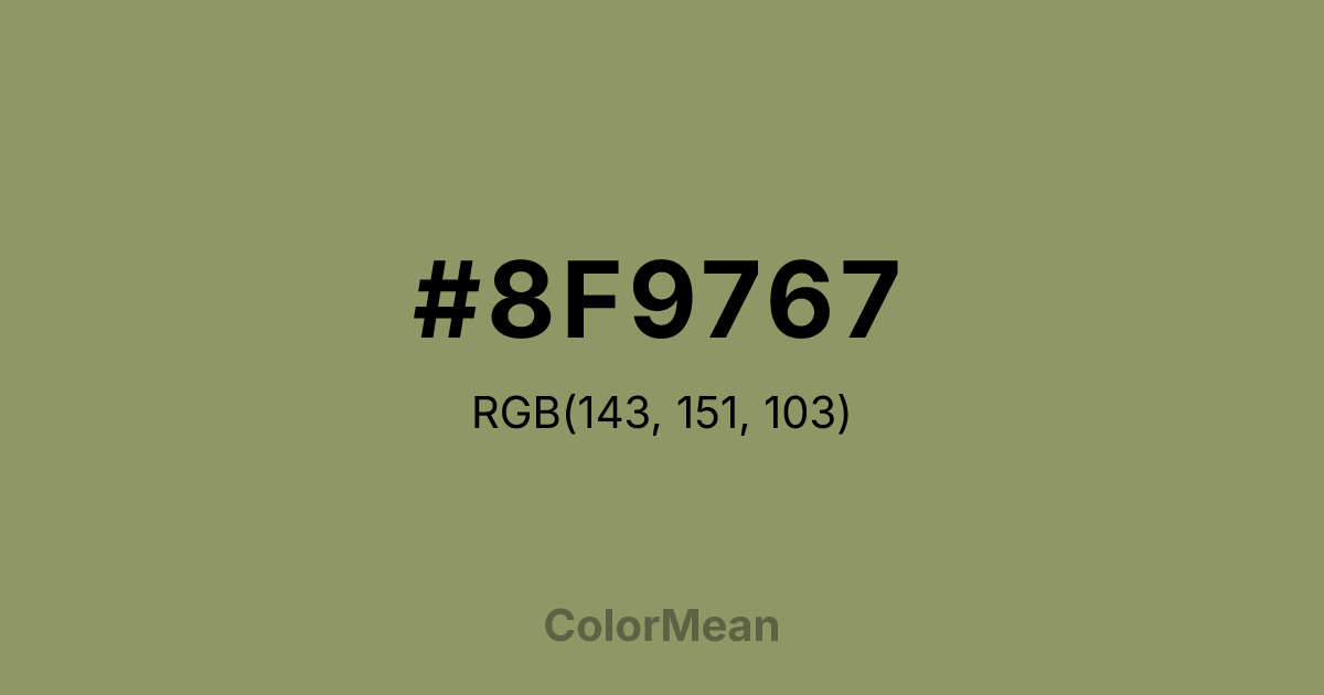 #8F9767 RGB value is (143, 151, 103). The hex color red value is 143, green is 151, and blue is 103. Its HSL format shows a hue of 70°, saturation of 19 percent, and lightness of 50 percent. The CMYK process values are 5 percent, 0 percent, 32 percent, 41 percent.