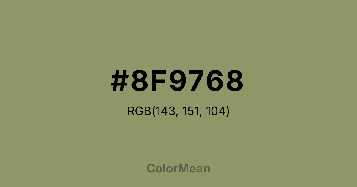 #8F9768 RGB value is (143, 151, 104). The hex color red value is 143, green is 151, and blue is 104. Its HSL format shows a hue of 70°, saturation of 18 percent, and lightness of 50 percent. The CMYK process values are 5 percent, 0 percent, 31 percent, 41 percent.