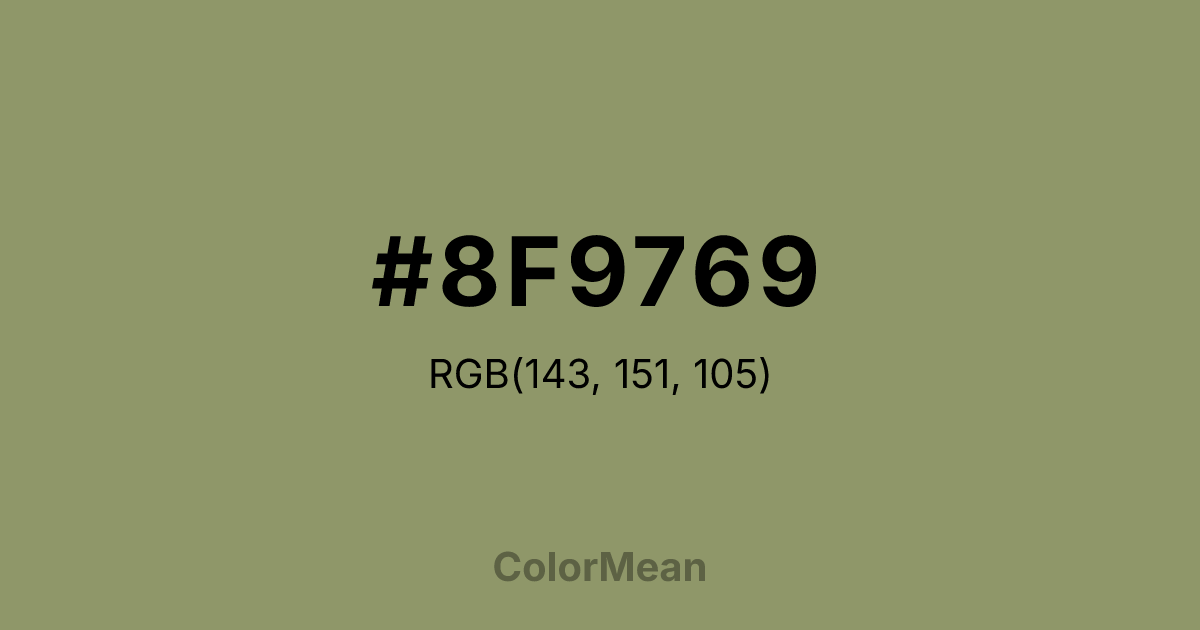 #8F9769 RGB value is (143, 151, 105). The hex color red value is 143, green is 151, and blue is 105. Its HSL format shows a hue of 70°, saturation of 18 percent, and lightness of 50 percent. The CMYK process values are 5 percent, 0 percent, 30 percent, 41 percent.