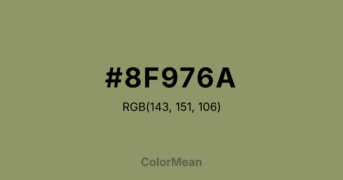 #8F976A RGB value is (143, 151, 106). The hex color red value is 143, green is 151, and blue is 106. Its HSL format shows a hue of 71°, saturation of 18 percent, and lightness of 50 percent. The CMYK process values are 5 percent, 0 percent, 30 percent, 41 percent.