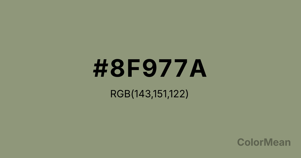 #8F977A RGB value is (143, 151, 122). The hex color red value is 143, green is 151, and blue is 122. Its HSL format shows a hue of 77°, saturation of 12 percent, and lightness of 54 percent. The CMYK process values are 5 percent, 0 percent, 19 percent, 41 percent.