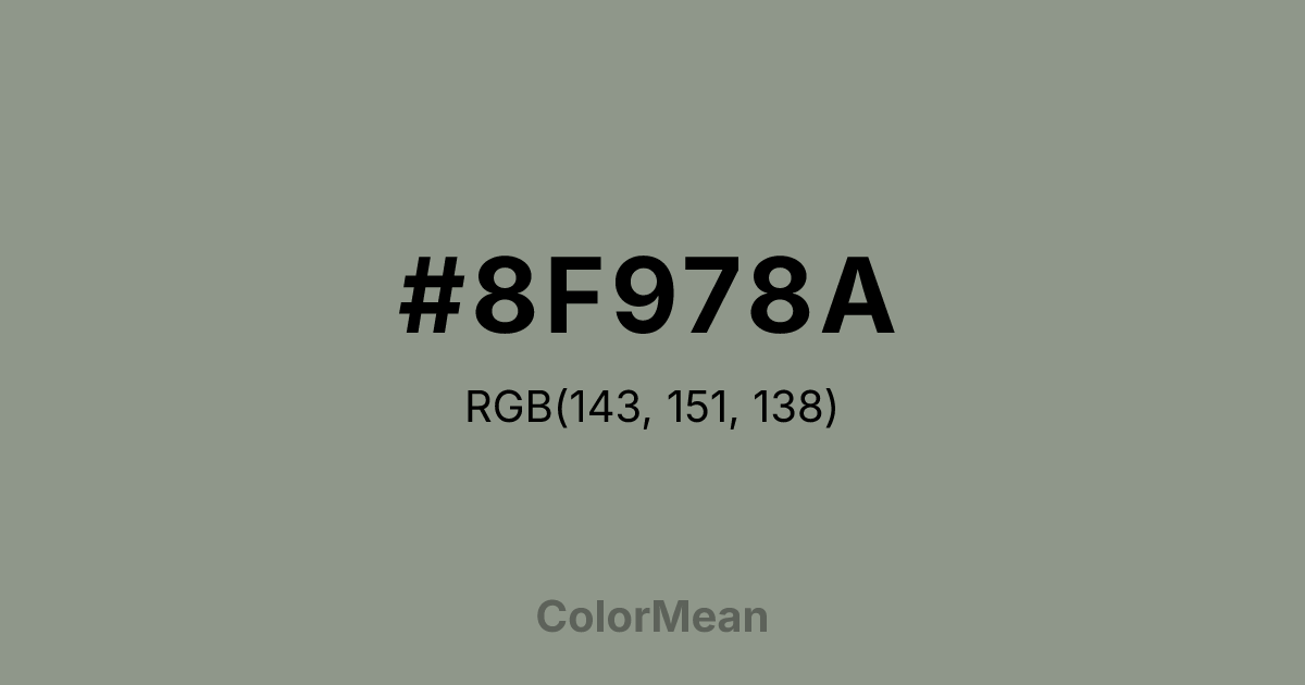 #8F978A RGB value is (143, 151, 138). The hex color red value is 143, green is 151, and blue is 138. Its HSL format shows a hue of 97°, saturation of 6 percent, and lightness of 57 percent. The CMYK process values are 5 percent, 0 percent, 9 percent, 41 percent.