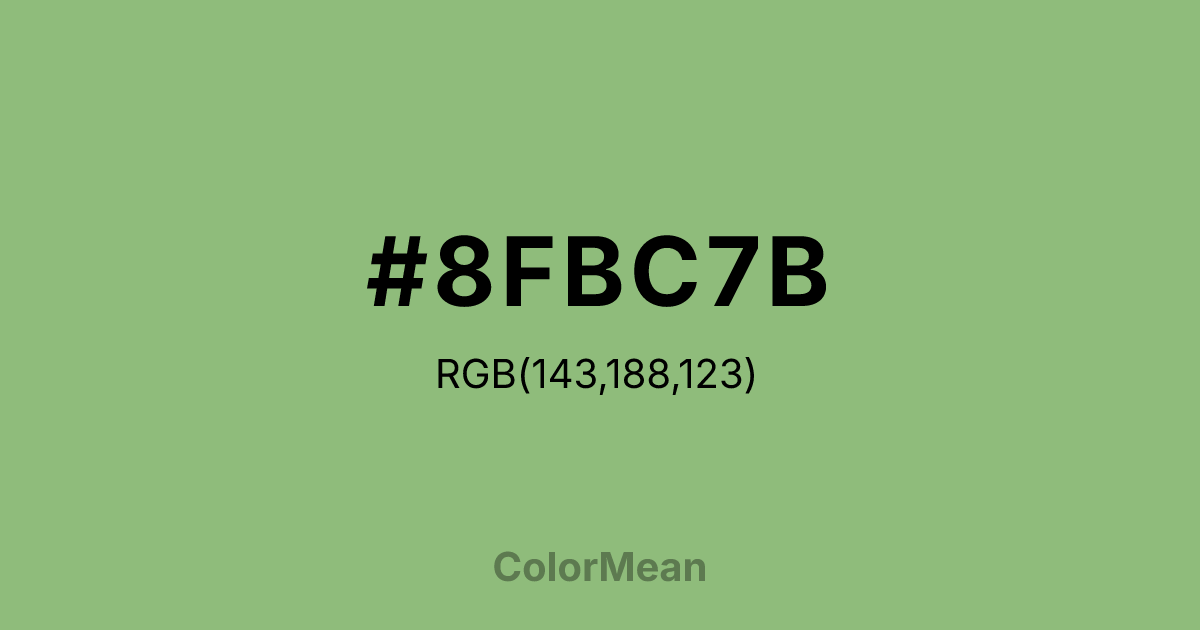 #8FBC7B RGB value is (143, 188, 123). The hex color red value is 143, green is 188, and blue is 123. Its HSL format shows a hue of 102°, saturation of 33 percent, and lightness of 61 percent. The CMYK process values are 24 percent, 0 percent, 35 percent, 26 percent.