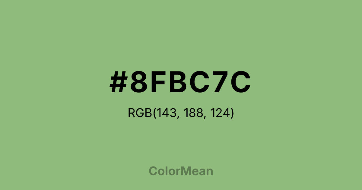 #8FBC7C RGB value is (143, 188, 124). The hex color red value is 143, green is 188, and blue is 124. Its HSL format shows a hue of 102°, saturation of 32 percent, and lightness of 61 percent. The CMYK process values are 24 percent, 0 percent, 34 percent, 26 percent.