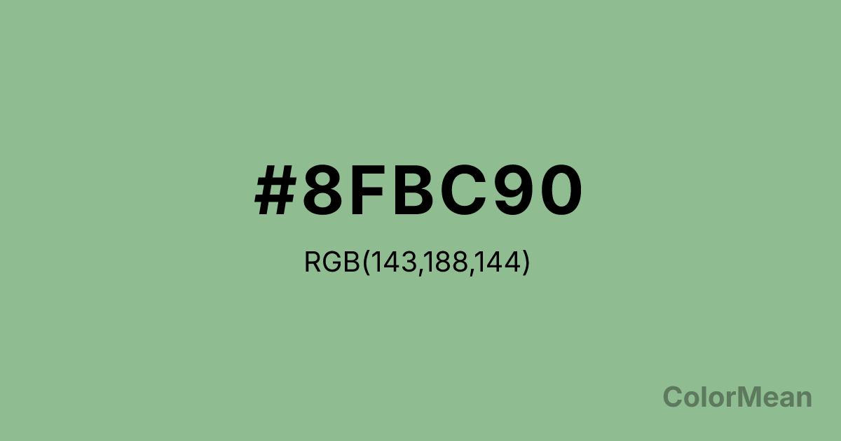 #8FBC90 RGB value is (143, 188, 144). The hex color red value is 143, green is 188, and blue is 144. Its HSL format shows a hue of 121°, saturation of 25 percent, and lightness of 65 percent. The CMYK process values are 24 percent, 0 percent, 23 percent, 26 percent.