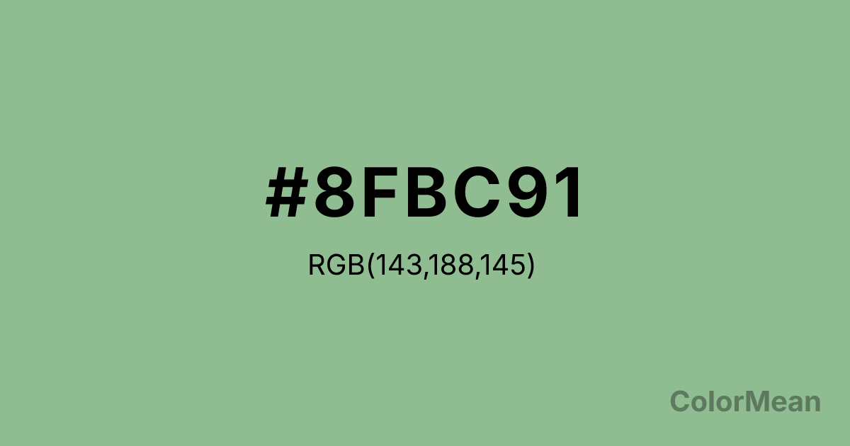 #8FBC91 RGB value is (143, 188, 145). The hex color red value is 143, green is 188, and blue is 145. Its HSL format shows a hue of 123°, saturation of 25 percent, and lightness of 65 percent. The CMYK process values are 24 percent, 0 percent, 23 percent, 26 percent.