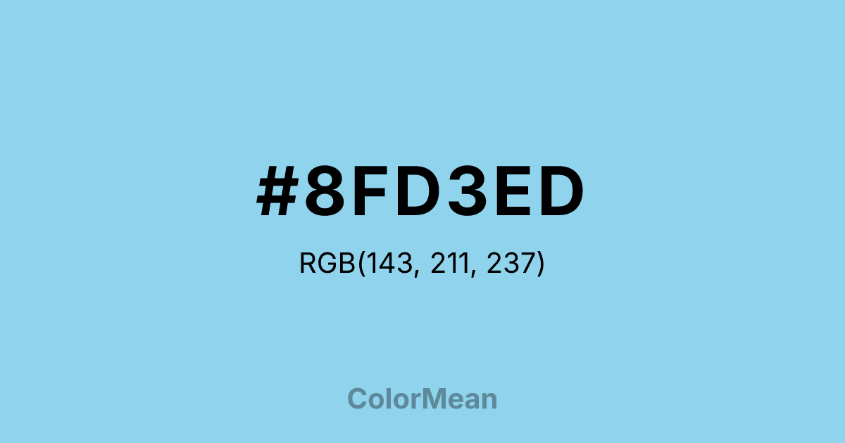 #8FD3ED RGB value is (143, 211, 237). The hex color red value is 143, green is 211, and blue is 237. Its HSL format shows a hue of 197°, saturation of 72 percent, and lightness of 75 percent. The CMYK process values are 40 percent, 11 percent, 0 percent, 7 percent.