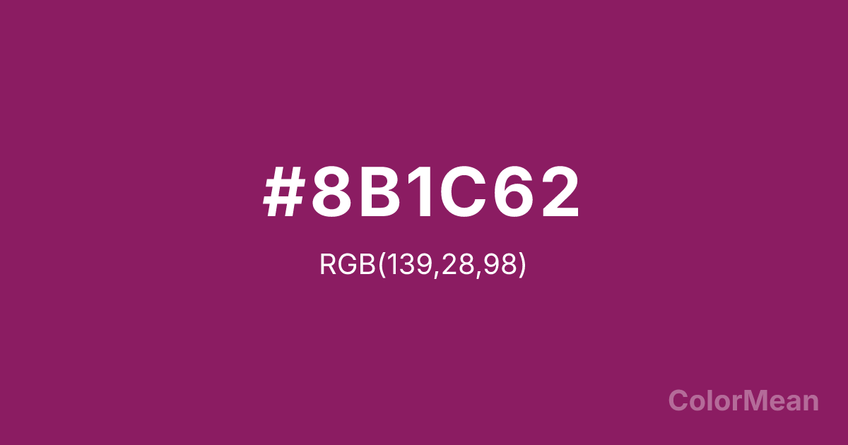 Maroon4 (#8B1C62) RGB value is (139, 28, 98). The hex color red value is 139, green is 28, and blue is 98. Its HSL format shows a hue of 322°, saturation of 66 percent, and lightness of 33 percent. The CMYK process values are 0 percent, 80 percent, 29 percent, 45 percent.