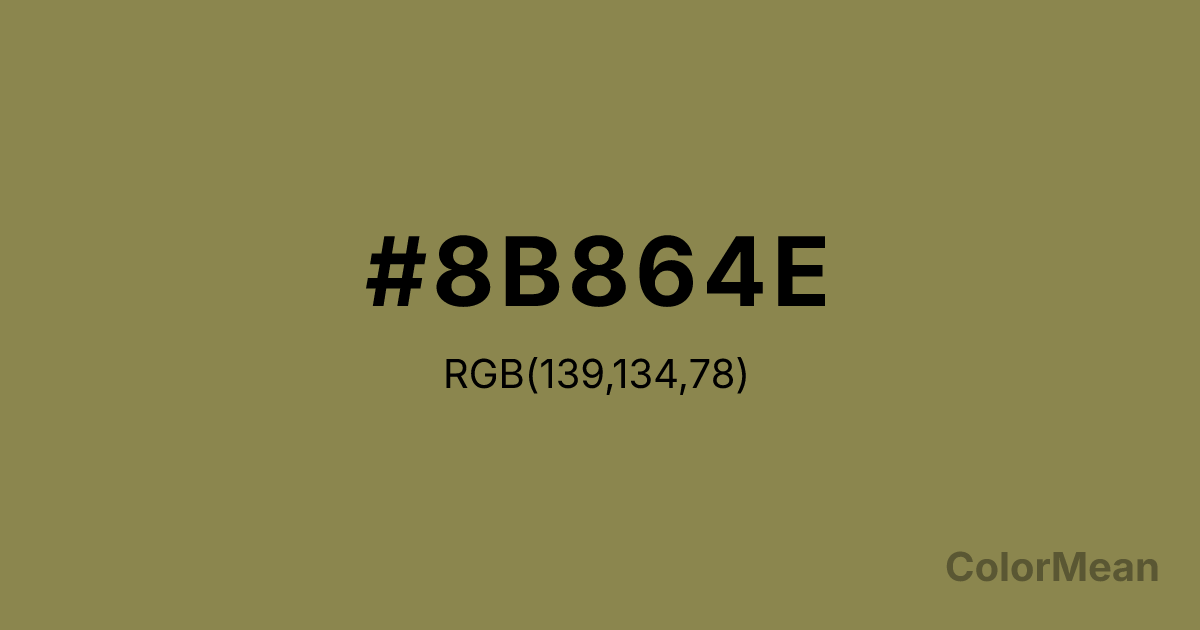 Khaki4 (#8B864E) RGB value is (139, 134, 78). The hex color red value is 139, green is 134, and blue is 78. Its HSL format shows a hue of 55°, saturation of 28 percent, and lightness of 43 percent. The CMYK process values are 0 percent, 4 percent, 44 percent, 45 percent.