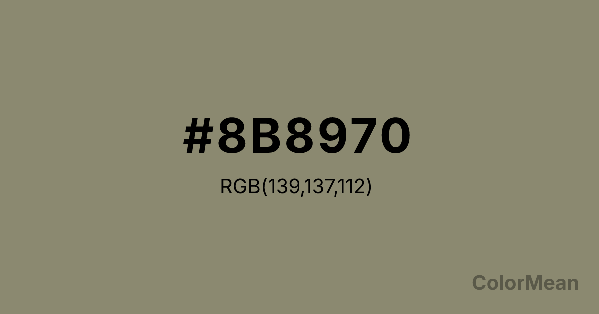 LemonChiffon4 (#8B8970) RGB value is (139, 137, 112). The hex color red value is 139, green is 137, and blue is 112. Its HSL format shows a hue of 56°, saturation of 11 percent, and lightness of 49 percent. The CMYK process values are 0 percent, 1 percent, 19 percent, 45 percent.