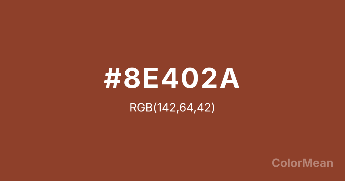 Copper Brown (#8E402A) RGB value is (142, 64, 42). The hex color red value is 142, green is 64, and blue is 42. Its HSL format shows a hue of 13°, saturation of 54 percent, and lightness of 36 percent. The CMYK process values are 0 percent, 55 percent, 70 percent, 44 percent.
