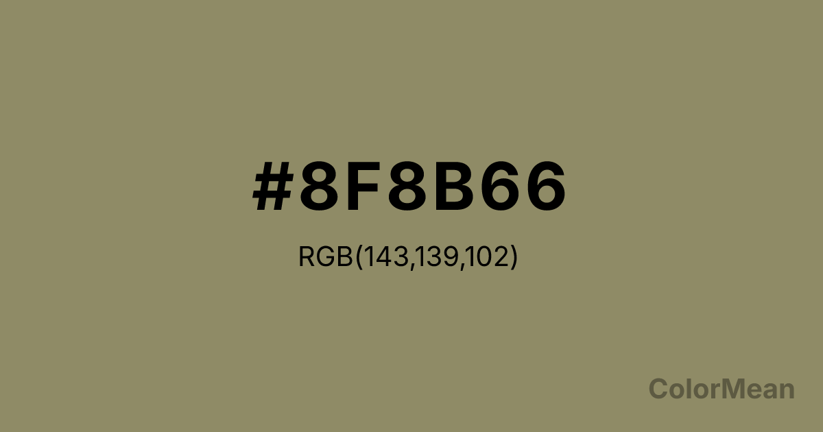 Yellow Grey (#8F8B66) RGB value is (143, 139, 102). The hex color red value is 143, green is 139, and blue is 102. Its HSL format shows a hue of 54°, saturation of 17 percent, and lightness of 48 percent. The CMYK process values are 0 percent, 3 percent, 29 percent, 44 percent.