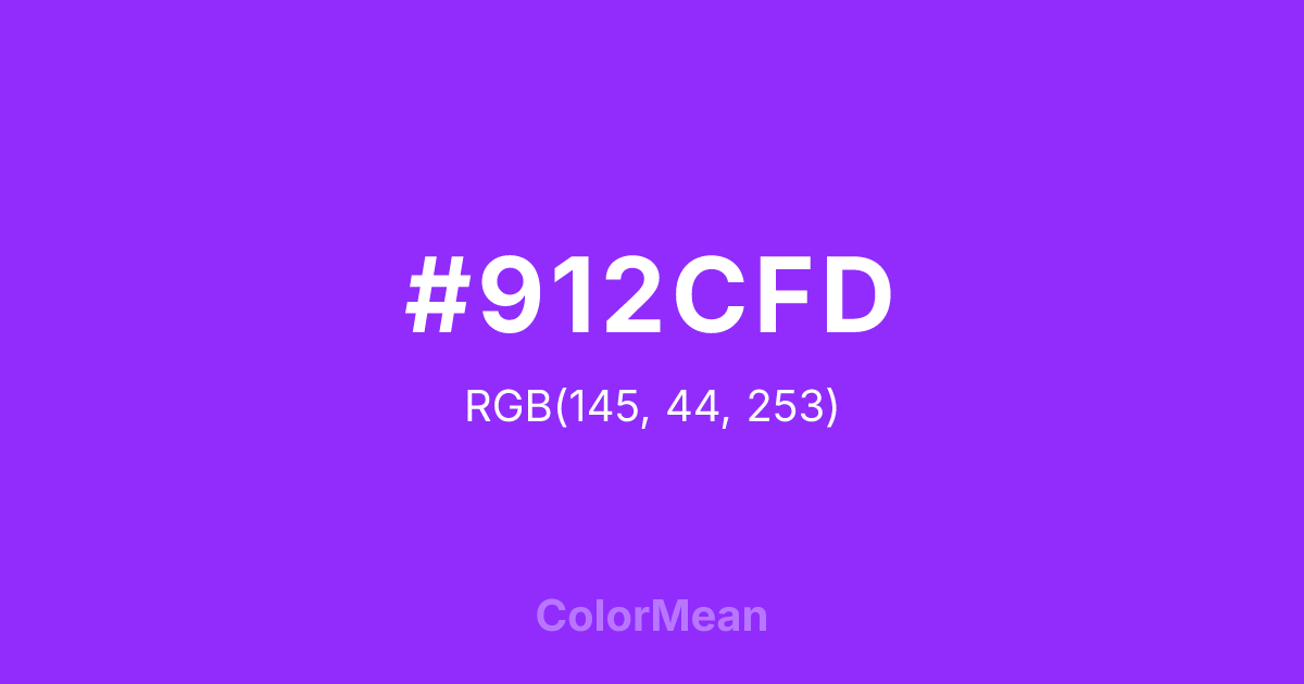 #912CFD RGB value is (145, 44, 253). The hex color red value is 145, green is 44, and blue is 253. Its HSL format shows a hue of 269°, saturation of 98 percent, and lightness of 58 percent. The CMYK process values are 43 percent, 83 percent, 0 percent, 1 percent.